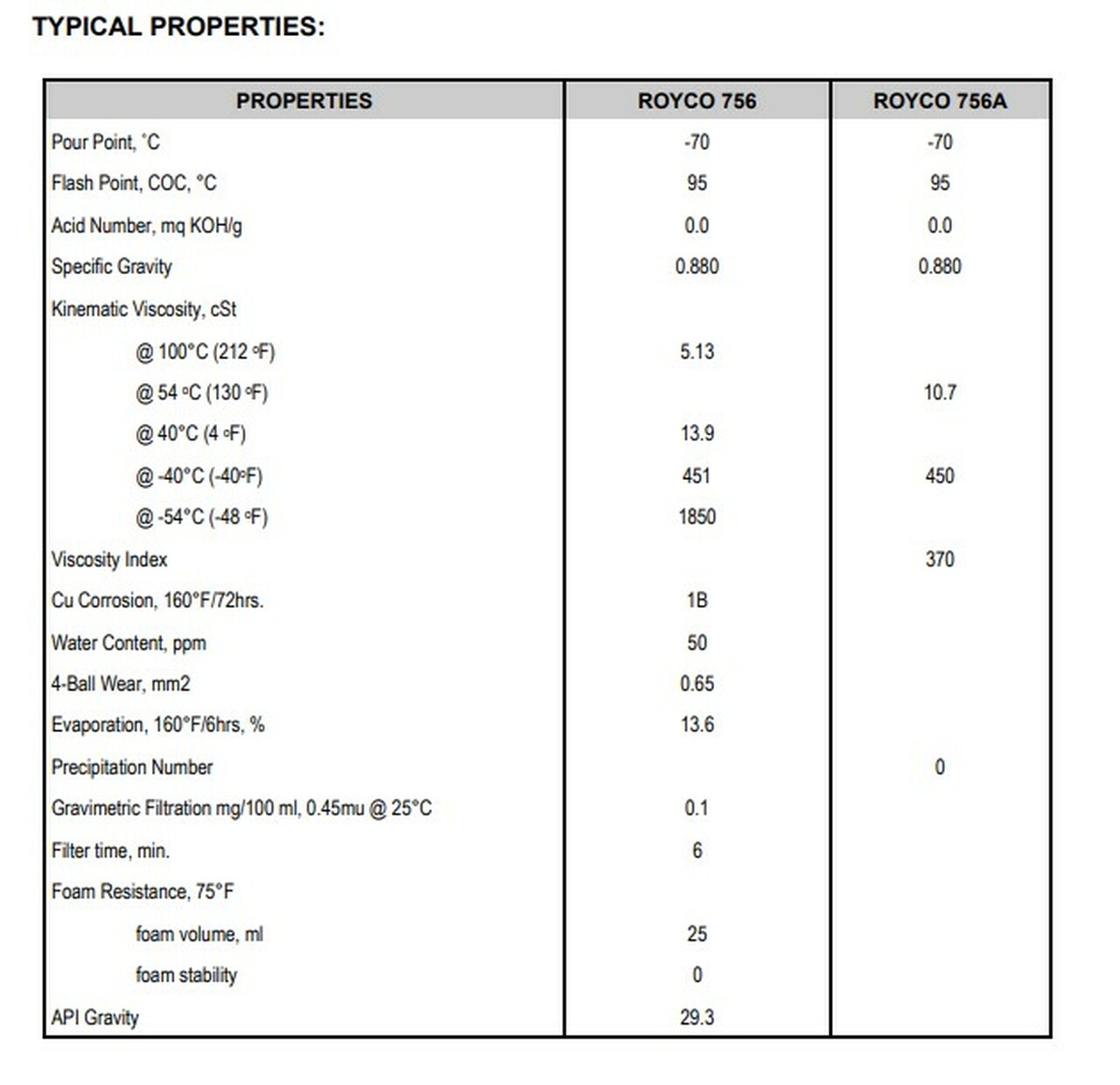 ROYCO 756 cumple con todos los requisitos y está calificado según MIL-SPEC: Mil-PRF-5606H que reemplaza a Mil-H-5606, Mil-O-5606, AN-O-336, AN-VV-O-336 y AAF-3580 . ROYCO 756A cumple con Mil-H-5606A.