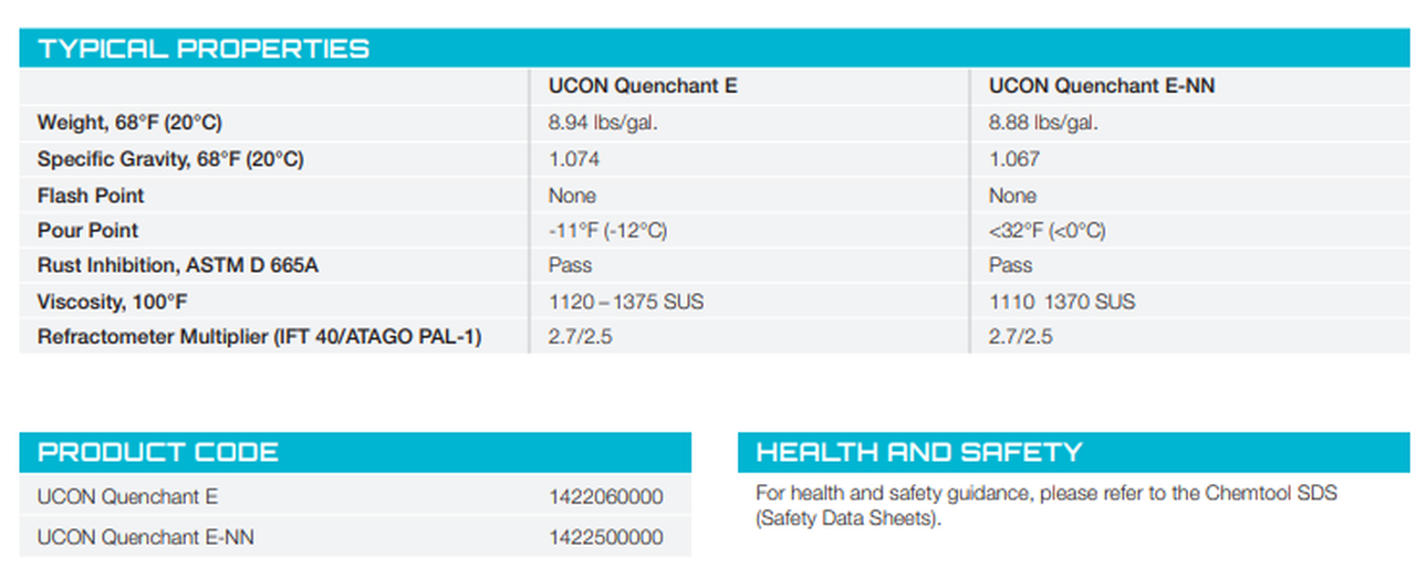 La principal diferencia entre UCON Quenchant E-NN y otros UCON Quenchants es la elección de la composición del polímero, que proporciona una transferencia de calor uniforme en aplicaciones típicas de aceite.