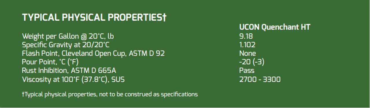UCON™ Quenchant HT es un quenchant polimérico no inflamable fabricado por The Dow Chemical Company. Es una solución acuosa de un polímero orgánico líquido e inhibidor de la acorrosión.