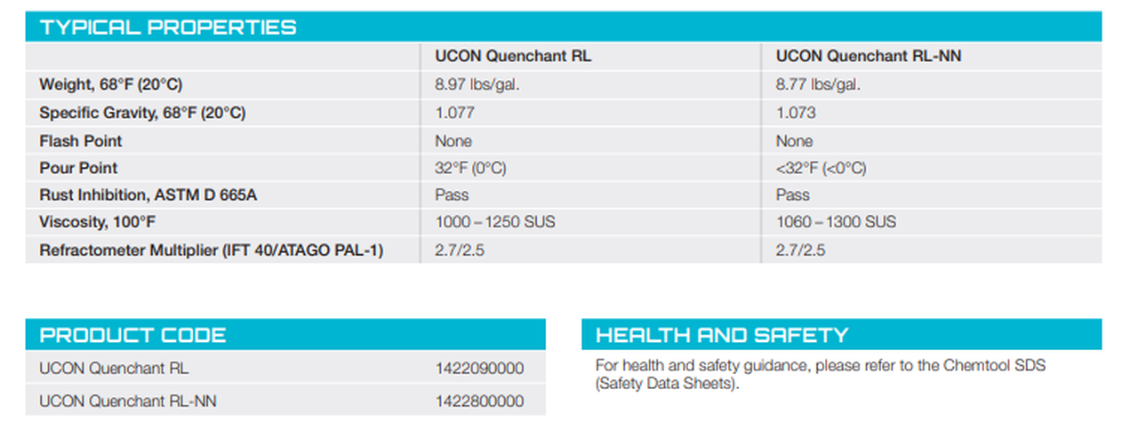 La principal diferencia entre UCON Quenchant RL-NN y los otros UCON Quenchants es la composición del polímero, que proporciona una transferencia de calor uniforme en una amplia gama de aplicaciones.