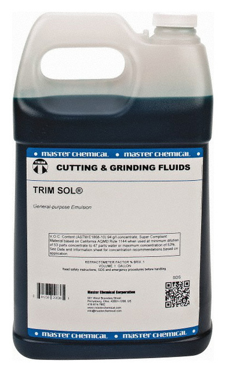 TRIM SOL es un concentrado de refrigerante de aceite soluble (emulsión) que es el refrigerante multimetálico de uso general estándar mundial para el mecanizado general de materiales ferrosos y no ferrosos. Tiene la lubricidad y las «agallas» necesarias para realizar trabajos de centro de mecanizado de servicio pesado y aún así proporcionar la humectación y el enfriamiento necesarios para las operaciones de torneado y rectificado de alta velocidad.®