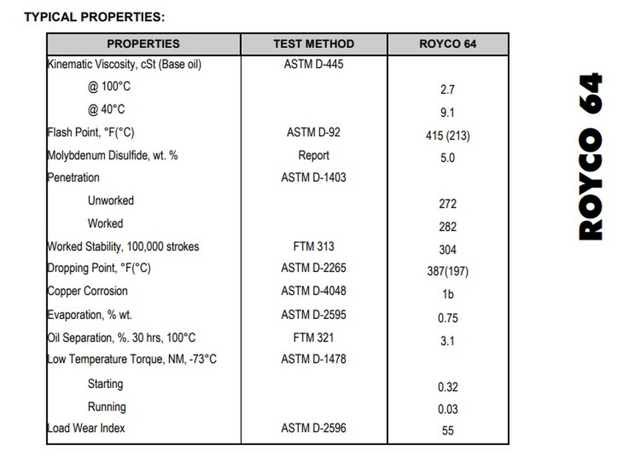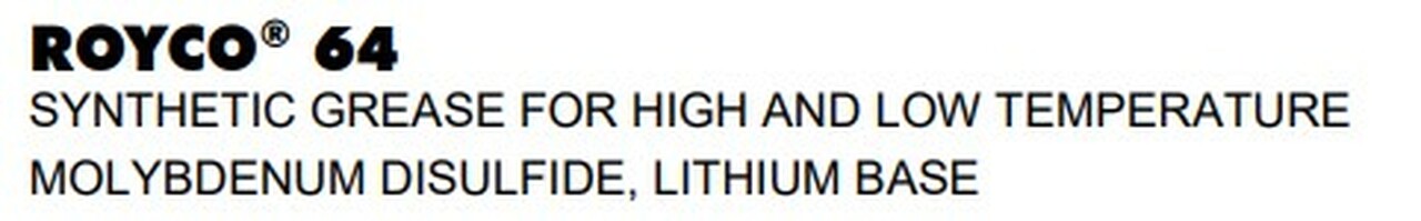 ROYCO 64 es una grasa espesada con hidroxiestearato de litio-12 formulada con disulfuro de molibdeno microfino y un aceite sintético a base de éster térmicamente estable. Los aditivos modernos se utilizan para proporcionar una gran capacidad de carga, protección contra la herrumbre y la oxidación, rendimiento EP y estabilidad al corte. Las partículas microfinas de “Moly” se adhieren y penetran en las superficies metálicas proporcionando así lubricación y protección contra el agarrotamiento incluso cuando se retira el componente de aceite o existe la posibilidad de una lubricación inadecuada debido a la dispersión mecánica.