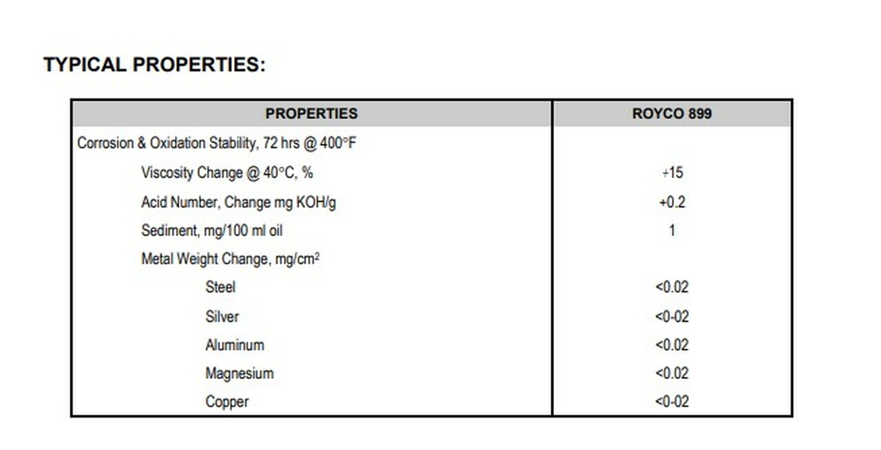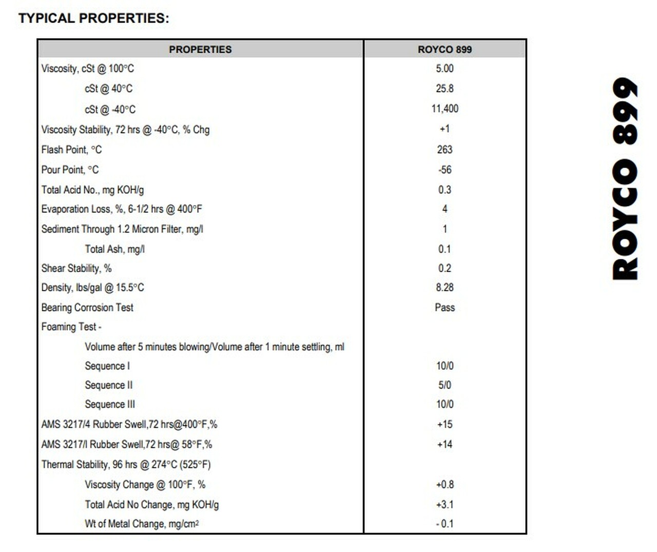 ROYCO 899 está completamente calificado para el nivel de revisión actual de MIL-SPEC del gobierno de EE. UU.: MIL-PRF-23699F Grado C/I.