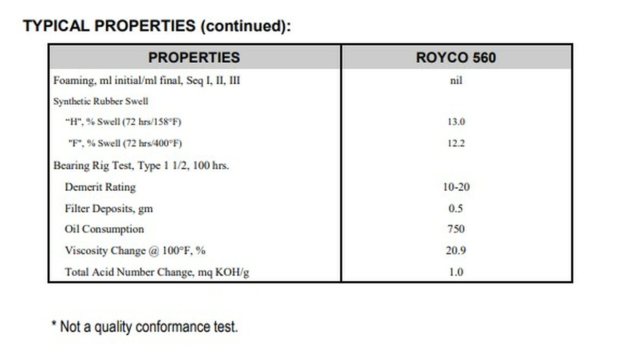 ROYCO 560 ha sido desarrollado para las crecientes demandas de los últimos desarrollos tecnológicos en motores de turbina de gas. Con la llegada de motores con una relación de derivación más alta, mayor potencia de empuje y, en consecuencia, mayores temperaturas y presiones de operación del motor, este fluido ha demostrado ahorros notables en menores costos de mantenimiento y tiempo de inactividad. ROYCO 560 supera con creces el rendimiento de los fluidos tradicionales Tipo II (Mil-PRF 23699) al combinar una mayor estabilidad termooxidativa con una menor formación de residuos de carbono. Esto da como resultado un mejor rendimiento del motor y períodos más largos entre MOH. Además, este aceite de tercera generación se puede usar en cualquier motor más antiguo diseñado para funcionar con fluidos tipo Mil-L-23699, de modo que incluso estos motores pueden obtener los mismos beneficios de rendimiento. Por supuesto,