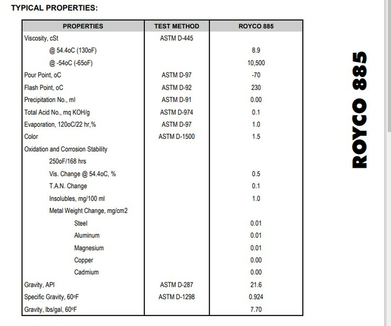 ROYCO 885 está calificado y cumple con los requisitos de MIL-SPEC: MIL-PRF-6085D, así como con la Especificación de materiales de Boeing: BMS 3-7.