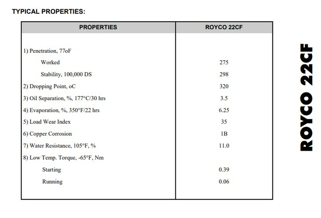 ROYCO 22CF cumple con todos los requisitos y está calificado según MIL-SPEC: MIL-PRF-81322F Grade NLGI 2.