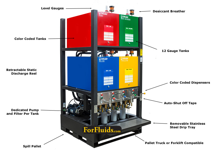 El sistema avanzado de almacenamiento a granel Oil Safe puede ponerlo al día fácilmente con las mejores prácticas. Este diseño eficiente en el espacio cuenta con codificación de colores, grifos de dispensación presurizados, contención de derrames integrada y una bomba/filtro independiente para cada tanque que proporciona filtración de 3 vías (filtros durante el llenado, recirculación (bucle de riñón) y dispensación). Viene estándar con un filtro Beta 2000 de 7 micras, otras clasificaciones disponibles. Se envía ensamblado y prácticamente listo para usar: solo atornille los grifos y la bandeja de goteo, instale los indicadores de nivel y los respiraderos, conéctelo y tendrá un sistema de almacenamiento de mejores prácticas.