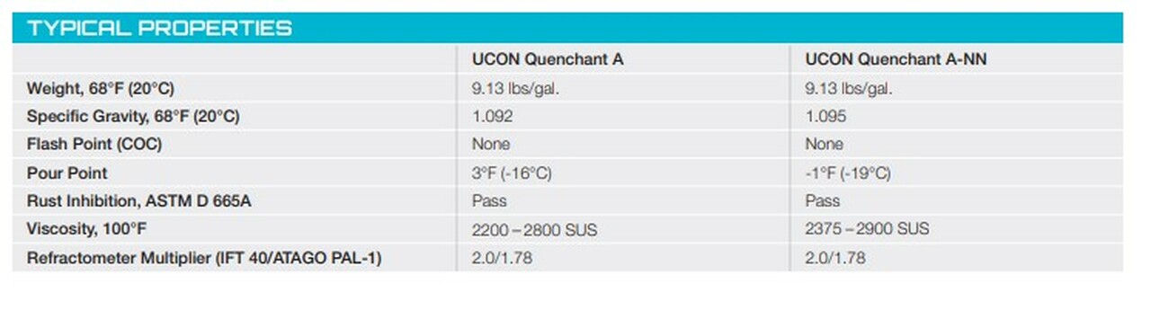La velocidad de enfriamiento también se controla ajustando la temperatura del baño de enfriamiento y / o la velocidad de agitación. Estos parámetros, junto con la orientación del producto, permiten que UCON Quenchant A y A-NN funcionen uniformemente en el rango de transferencia de calor desde agua hasta aceites de velocidad media.